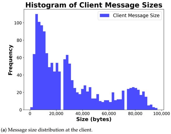 Additionally, the histograms in Figure 11 present the frequency distribution of message sizes, which further confirms that the client and server distributions remain closely matched. This behavior indicates robust system performance, with minimal packet loss or corruption.
