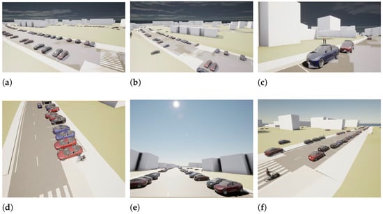 Virtual representation of real-time detected static and dynamic road users: detection is performed with onboard perception module, which then communicates and spawns into the digital twin at the server. (a) Parked vehicles. (b) Parked vehicles. (c) Parked vehicles + pedestrian. (d) Parked vehicles + dynamic vehicle and cyclist. (e) Parked vehicles. (f) Parked vehicles + dynamic cyclist.