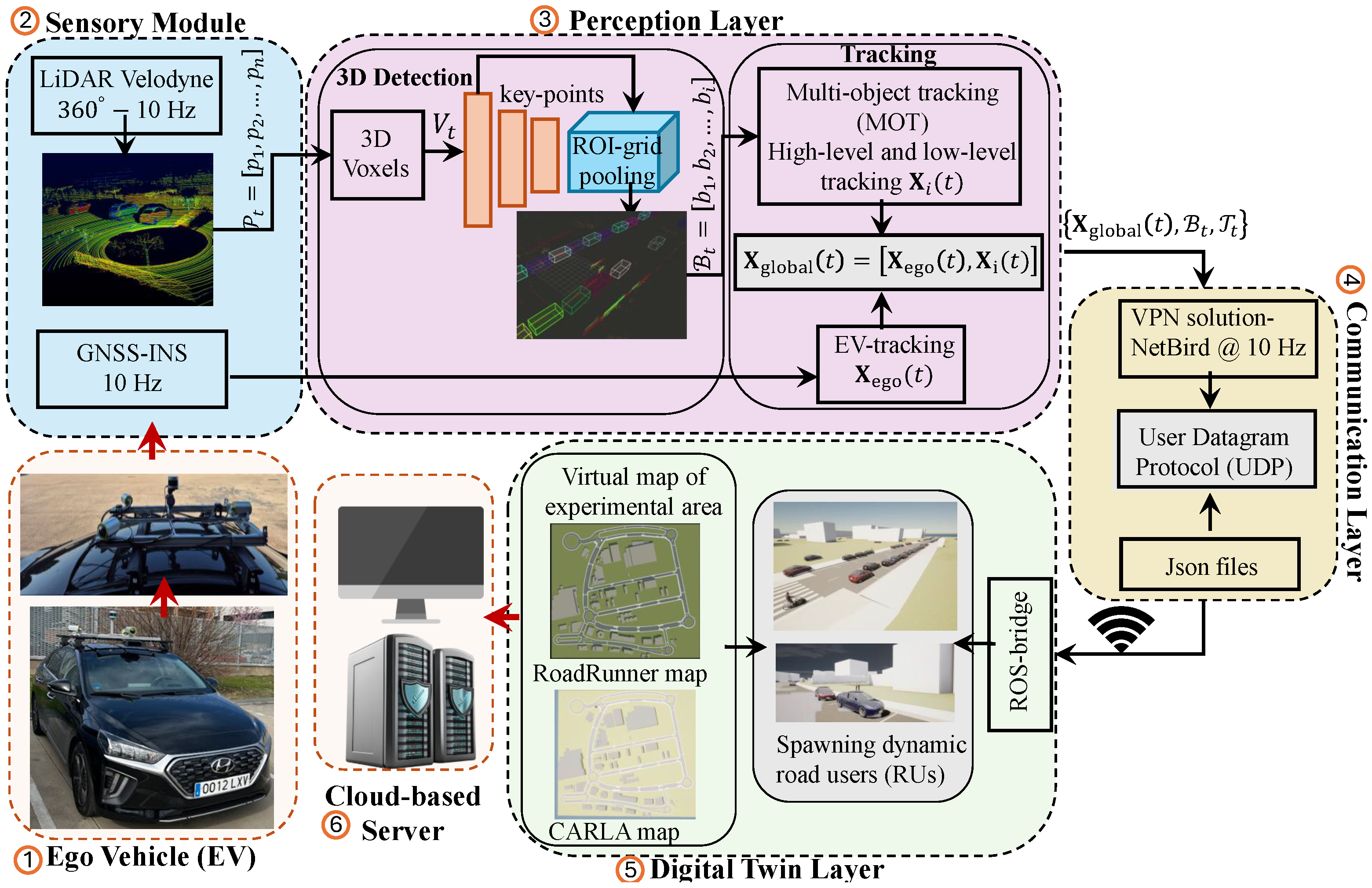 - Development of a cloud-based, high-fidelity digital twin that replicates the real traffic environment in synchronization with physical real-world perception data, enabling city scale situational awareness and safe virtual testing.