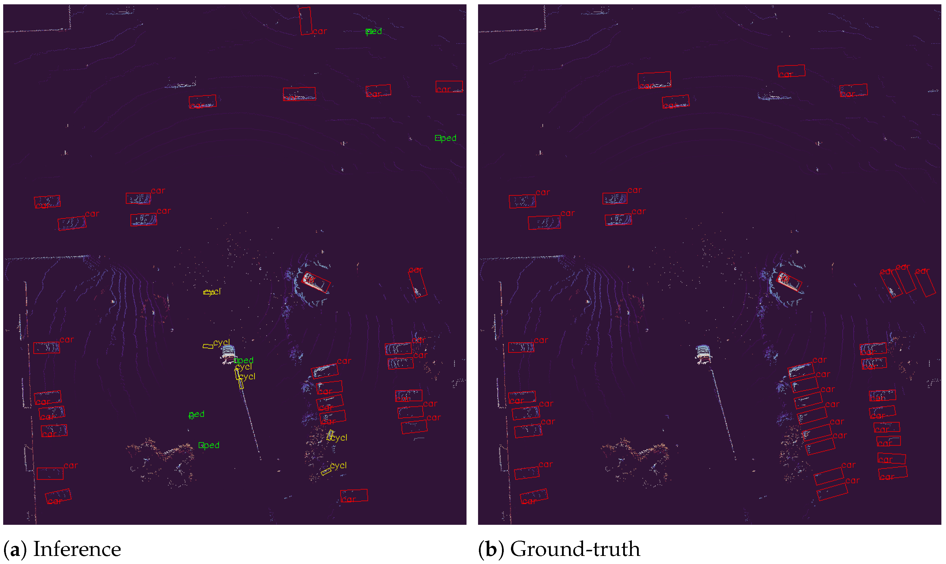 - Xiao, P.; Shao, Z.; Hao, S.; Zhang, Z.; Chai, X.; Jiao, J.; Li, Z.; Wu, J.; Sun, K.; Jiang, K.; et al. Pandaset: Advanced sensor suite dataset for autonomous driving. In Proceedings of the 2021 IEEE International Intelligent Transportation Systems Conference (ITSC), Indianapolis, IN, USA, 19–22 September 2021; pp. 3095–3101. [Google Scholar]