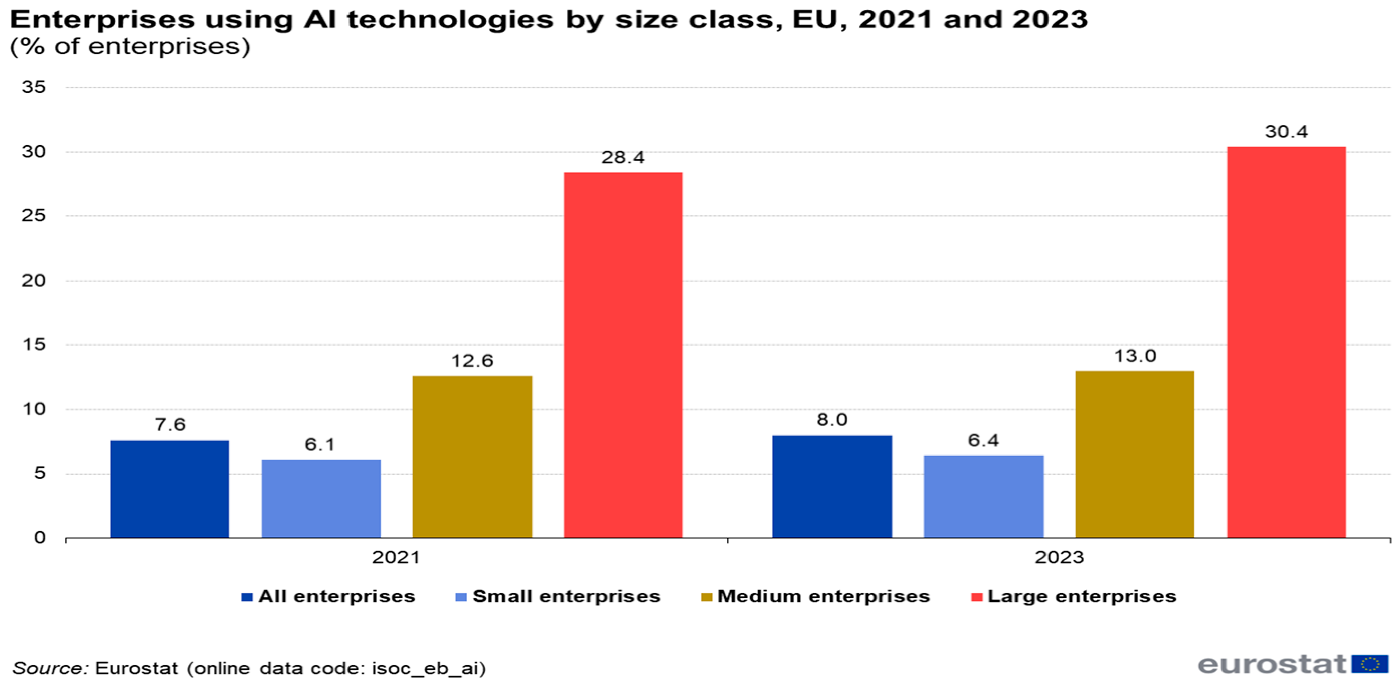 The 2023. 26.2% of enterprises used artificial intelligence technologies in the form of software or other ICT security systems (e.g., machine learning to detect and prevent cyberattacks), while another 25.8% used it for accounting, control, or financial management. Only 9.6% of enterprises using artificial intelligence technologies use software or systems with embedded AI for logistics (