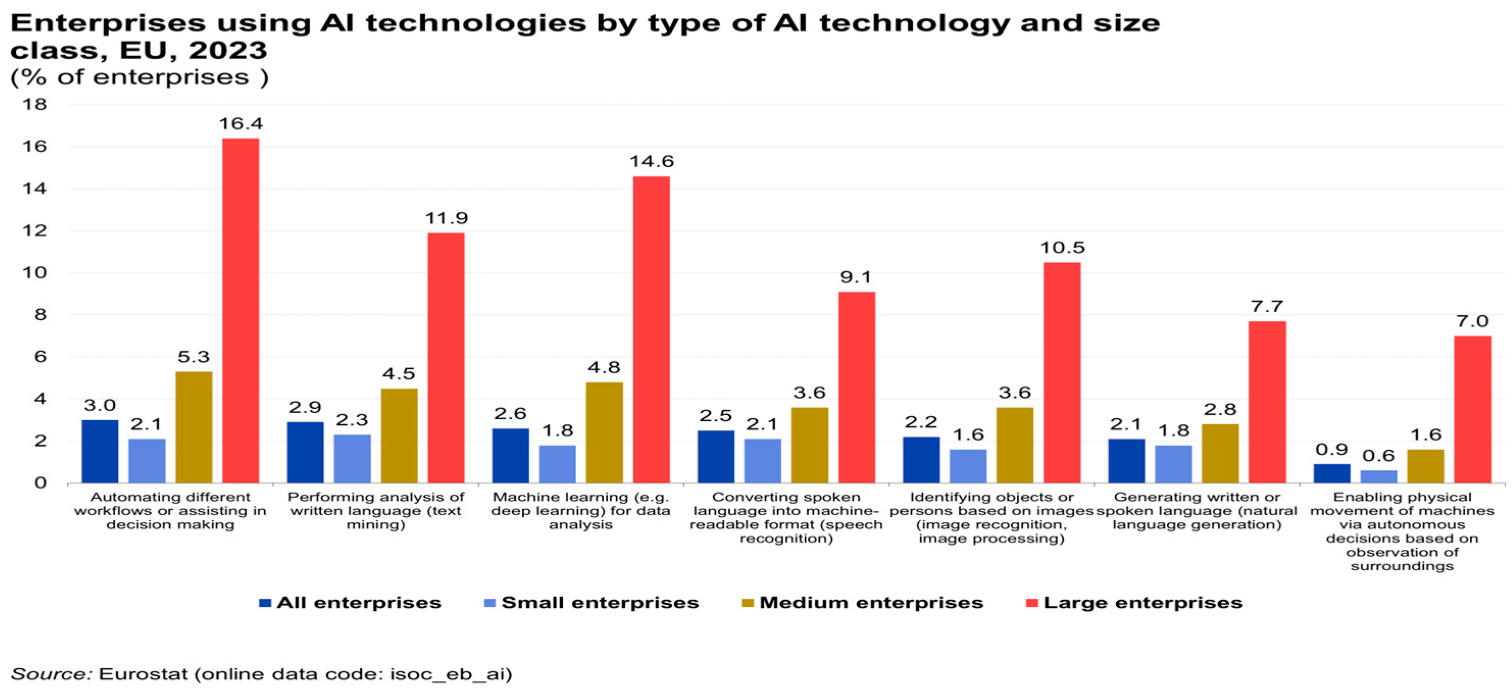 Figure 5, it is clear that no single AI-related technology predominates. The more common artificial intelligence technologies primarily automate various work processes or support decision-making (e.g., artificial intelligence-based software for automating robotic processes). In 2023, such technologies were used by about 3% of enterprises. The application of this type of know-how is mainly expressed in: