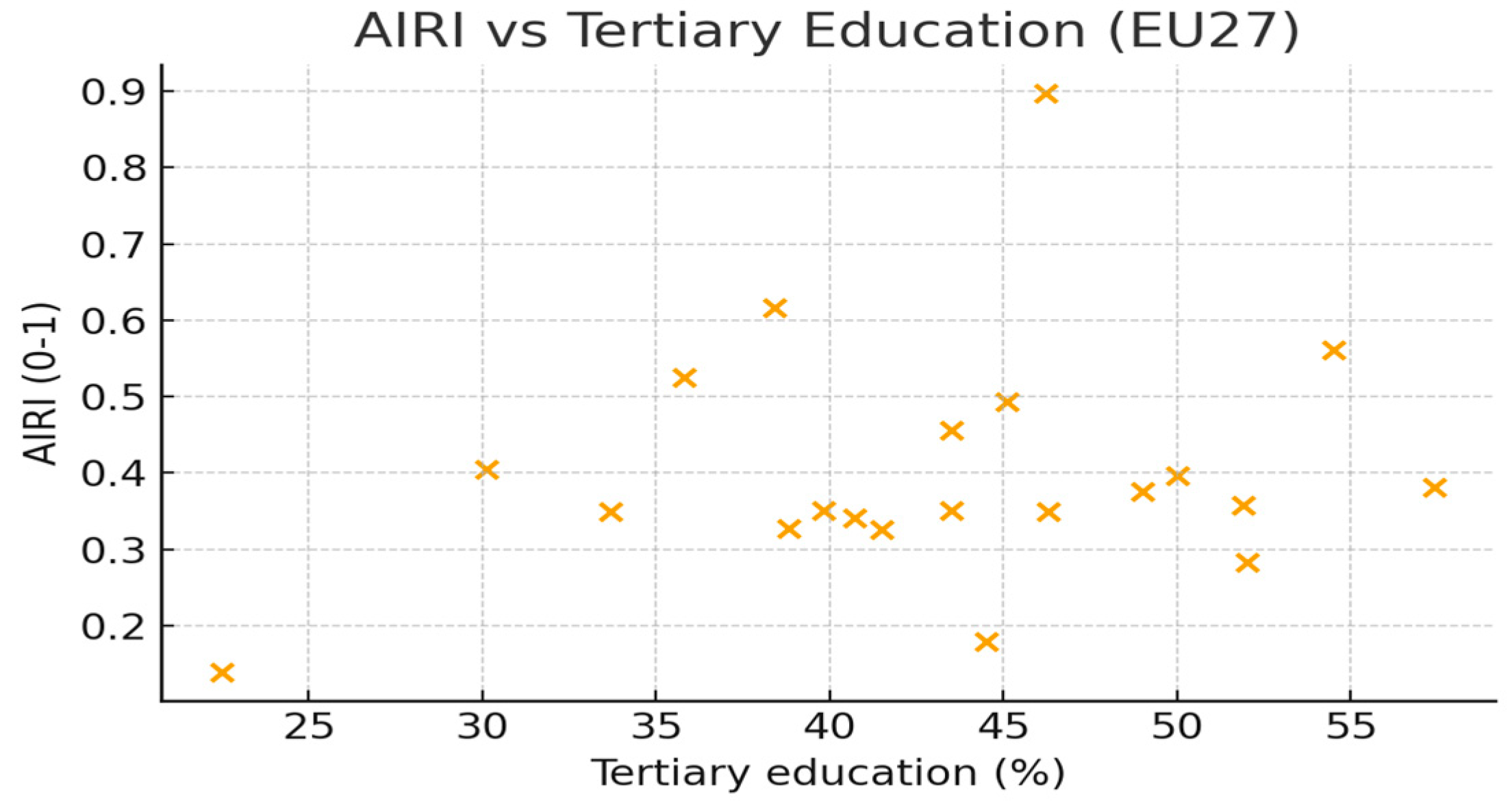 71]. Correlation analysis establishes a strong link between the composite AI readiness index, artificial intelligence, and educational attainment. The strong link between universities and industry, expressed through the development and application of artificial intelligence, has been analyzed in China, which fully confirms the results of this study [