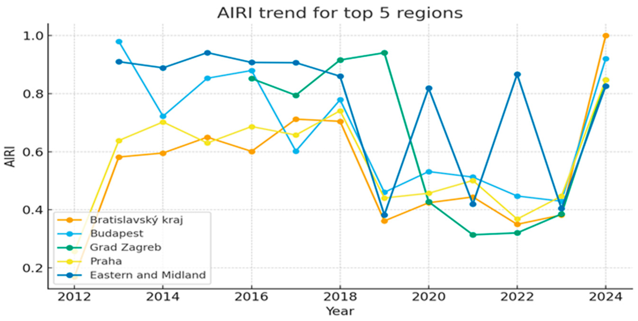 Figure 10). This means the top 5 regions are experiencing sustainable growth driven by innovation and AI adoption. The AIRI trends for the top five areas show that the Bratislava region (Bratislavsky kraj) in Slovakia, Budapest in Hungary, the city of Zagreb in Croatia, Prague in the Czech Republic, and the Eastern and Midland regions show high performance.