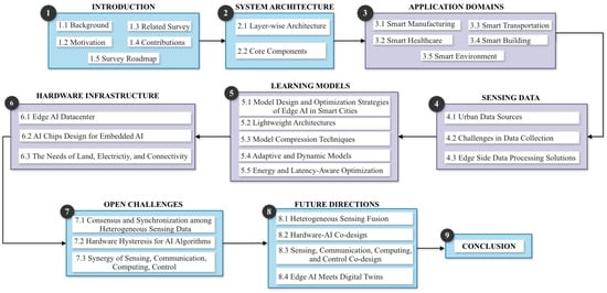 As illustrated in Figure 1, we now provide a road map of the survey. The survey is structured to provide a comprehensive understanding of the edge AI ecosystem for smart cities. In particular, Section 2, the summary section, discusses our five focused heterogeneous domains, e.g., manufacturing, healthcare, transportation, buildings, and environment. Specifically, it presents a system architecture for edge AI-empowered smart cities, outlining the envisioned layer-wise design and its core components, e.g., spanning applications (in Section 3), sensing data (in Section 4), learning models (in Section 5), and hardware infrastructure (in Section 6). They collectively provide a comprehensive understanding of how edge AI supports smart-city applications from data collection to computation and deployment. Particularly, Section 3 surveys recent edge AI applications across five heterogeneous domains, namely manufacturing, healthcare, transportation, buildings, and environment. Each application is analyzed with respect to its deployed edge devices, learning algorithms, main contributions, benefits, and identified gaps. Section 4 shifts the focus to the data aspect, discussing sensing data sources, challenges, and edge-side data processing solutions. Section 5 turns to edge AI learning models, covering lightweight design, model compression, dynamic models, and energy-aware optimization. Section 6 reviews edge AI hardware infrastructures that enable these edge-intelligent systems, including data centers, chip design, and supporting resources in land, electricity, and networking connectivity. Section 7 provides several open challenges, including data heterogeneity, hardware hysteresis, the need for synergy across sensing, communication, computing, and control as well as ethical, governance and policy, security, and privacy considerations. Section 8 explores future research directions, including heterogeneous sensing fusion, hardware–AI co-design, system-level co-design, and integrations between edge AI and digital twins. Finally, Section 9 concludes with final remarks and reflections.