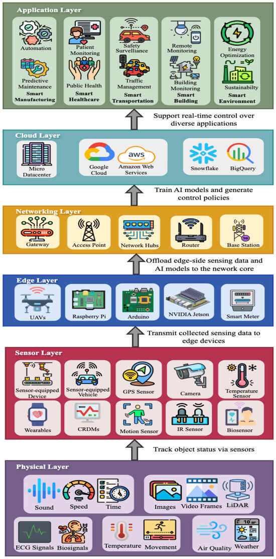 From the bottom to the top, specifically, at the physical layer, urban environments are monitored through rich sensing modalities such as sound, images, biosignals, weather, and air quality, which provide the raw foundation for focusing on objects enabling their intelligent services at upper layers. The sensor layer builds on this by employing heterogeneous devices, including cameras, GPS modules, wearables, environmental sensors, and biosensors, to capture domain-specific data in real time. The edge layer leverages resource-constrained but intelligent devices such as Unmanned Aerial Vehicles (UAVs), Raspberry Pi, Arduino boards, NVIDIA Jetson modules, and smart meters, which locally process sensing data and enable low-latency inference. These are supported by the networking layer, consisting of gateways, routers, access points, hubs, and base stations that interconnect distributed edge devices and transmit both raw and pre-processed data. The cloud layer provides powerful computing infrastructure such as data centers and commercial platforms (e.g., Google Cloud, Amazon Web Services (AWS), Snowflake, and BigQuery) that train large-scale models, manage city-wide data, and generate optimized control policies. At the top, the application layer enables smart city services, including predictive maintenance in manufacturing, patient monitoring in healthcare, traffic management in transportation, building monitoring, and energy optimization in urban environments. Together, these layers ensure that sensing, communication, computing, and control are integrated to provide real-time, reliable, and adaptive intelligence for urban operations.
