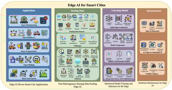 Edge Artificial Intelligence (Edge AI) has recently attracted significant attention because it brings learning and inference closer to data sources, reducing reliance on centralized cloud infrastructures [9,10,11]. This paradigm is especially important for smart city applications, where rapid response, privacy preservation, and energy efficiency are critical. Traditional cloud-centric approaches often fall short due to latency, bandwidth, privacy, and reliability concerns, particularly when crucial decisions must be made instantly for transportation safety, healthcare monitoring, or energy management. However, by enabling low-latency analytics directly on edge devices, edge AI empowers domains such as traffic management, environmental monitoring, healthcare, and industrial automation to operate more effectively.
