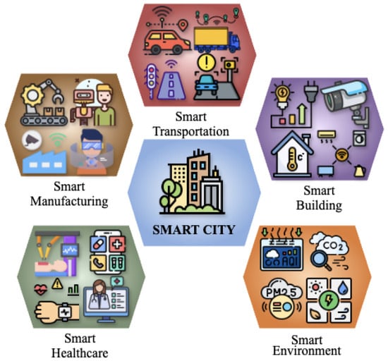 Smart cities have emerged as a central focus with the rapid development of the Internet of Things (IoT), Cyber–Physical Systems (CPS), Artificial Intelligence (AI), and 5G wireless communication technologies [1,2,3,4,5]. Smart cities are not only a research frontier but also a transformative concept that directly affects the daily lives of citizens. They enable more reliable public transportation, faster emergency responses, cleaner air through intelligent environmental monitoring, optimized energy usage in buildings, and improved healthcare through real-time monitoring and predictive services. Every day, billions of interconnected devices and sensors in urban environments generate unprecedented volumes of data, which must be processed, analyzed, and acted upon in real time. By leveraging IoT, CPS, AI, and next-generation wireless communication technologies [6,7,8], smart cities provide a rich opportunity to design intelligent solutions that can address pressing urban challenges while enhancing the efficiency, resilience, and sustainability of city services.