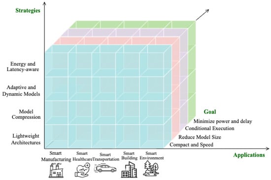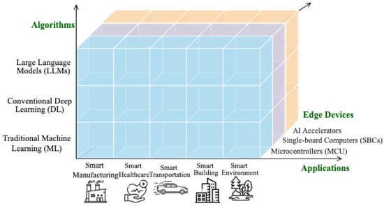 Figure 5 provides an overview of the five domains, showing how algorithmic design and hardware choices meet domain-specific requirements. In particular, smart Manufacturing focuses on automation, predictive maintenance, and industrial efficiency; Smart Healthcare enables telemedicine, remote monitoring, and data-driven diagnosis; Smart Transportation enhances mobility through traffic optimization, autonomous driving, and emergency response; Smart Building emphasizes energy management, occupant comfort, and security; and Smart Environment addresses air quality, waste management, and disaster preparedness. Although each domain pursues distinct objectives, they share common challenges, including real-time inference, limited edge resources, privacy and security concerns, and the scalability of heterogeneous systems. Thus, we will systematically summarize both the AI algorithms design and hardware selections in each domain, as shown in Figure 5, in what follows.