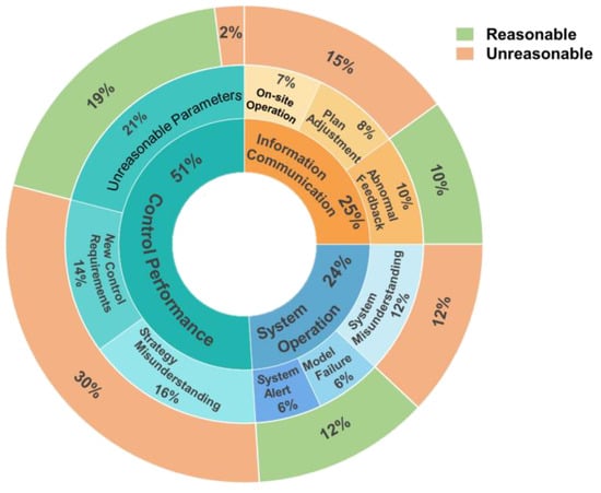 As shown in Table 1, many service events do not necessarily require switching to manual control intervention (switching from automated mode to manual mode). The decision is based on domain experts’ assessments. After the project, technicians classified manual intervention scenarios into fault-related and control-related switchovers. Fault-related switchovers were considered “reasonable,” while control-related ones were evaluated based on system performance before and after the switch. The project chief engineer reviewed the reasonableness of control-related switchovers, and if unclear, the autonomous driving team (three senior tunnel experts and two technical experts) conducted a discussion and vote. Switching to manual mode was deemed unreasonable if no safety or operational issues were detected. Among the 435 service events, 405 triggered manual intervention, which is clearly unreasonable. Therefore, the proportions of event categories were statistically analyzed, as shown in Figure 1. It was found that control performance accounted for approximately 51% of the total, with new control requirements and misunderstandings of the strategy together representing 30% and not requiring manual intervention. Similarly, in system operation incidents, system misunderstandings and information communication service events, such as on-site operations and plan adjustments, accounted for 27% and did not require manual intervention. This indicates that, due to the lack of appropriate human–machine interaction methods, frequent switching between control modes during autonomous tunneling significantly impacts the overall effectiveness of the autonomous tunneling control system.
