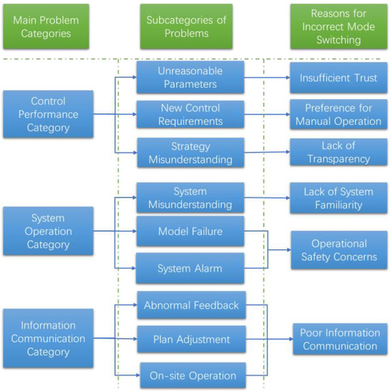 To further analyze potential human–machine collaboration issues, these three categories of service incidents were subdivided and examined to determine whether they led to manual mode switching. The analysis focused on determining whether each event stemmed primarily from communication and coordination needs or from control intervention requirements. The detailed results are presented in Table 1.