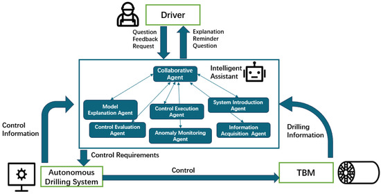 With the development of LLM technology, LLM-based intelligent agents [13] not only possess excellent natural language understanding and interaction capabilities but also decision-making and task-execution abilities. This provides technical support for addressing the poor explainability of autonomous tunneling control processes, communication difficulties, promoting decision transparency, and enhancing user trust and tunneling safety. However, the issues, doubts, parameter adjustment requests, and anomaly feedback raised by the driver during the tunneling process correspond to different collaboration tasks. The system must accurately recognize the driver’s intent to dispatch the appropriate task-oriented intelligent agents, thereby avoiding misoperations, erroneous feedback, or unnecessary manual control interventions. Therefore, intention recognition is a prerequisite for achieving high-quality human–machine collaboration. This paper designs and develops an LLM-based intelligent assistant for TBM autonomous tunneling, with intention recognition at its core. By coordinating the work of six task-oriented intelligent agents, the assistant provides multifunctional services such as explanation, evaluation, execution, and monitoring for the driver. Through communication with the intelligent assistant, drivers can resolve doubts, reduce cognitive load, and improve decision transparency. The intelligent assistant promptly identifies tunneling anomalies and proactively communicates with the driver, enhancing system fault tolerance and improving safety. Drivers can also issue commands to the intelligent assistant, efficiently conveying project information and control preferences, which, through automated task execution, enhances system adaptability.