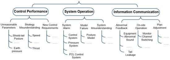 During the autonomous tunneling processes of six tunnel sections, a total of 435 service incidents occurred, of which 405 resulted in control mode switching (from autonomous mode to manual mode). These incidents are categorized into three main types: control performance, system operation, and information communication. (1) Control performance incidents refer to cases where drivers raised objections to the system’s control strategy or its outcomes, for instance, reporting that the propulsion oil pressure was unreasonable or that the cutterhead elevation was too low. (2) System operation incidents involve situations where drivers misuse system functions or misunderstand system outputs, such as forgetting to activate the control module or misinterpreting system warnings. (3) Information communication incidents refer to special situations, such as power failures, construction interruptions, or segment breakages, where drivers need to inform technical service staff due to the absence of an input channel for such events within the system