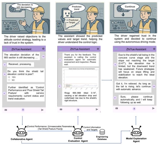 In conclusion, the proposed intelligent assistant serves not merely as an auxiliary tool for autonomous tunneling systems but functions as a collaborative hub connecting operators, tunneling systems, and TBM equipment. Its design and validation provide new theoretical and practical references for the intelligent development of tunnel construction, as well as innovative solutions for the thoughtful maintenance of underground infrastructure in smart city development. In complex and dynamically changing construction environments, the intelligent assistant can help the driver better understand system decisions and environmental changes through its built-in explanatory intelligent agents, thereby enhancing the driver’s trust in the system and ensuring the smooth automation of tunneling operations. Furthermore, while the intelligent assistant is currently deployed specifically for human–machine interaction (HMI) in the autonomous operation of shield tunneling machines, its core design, encompassing intention recognition and multi-agent collaboration architecture, renders it equally applicable to HMI scenarios across automation processes in other domains. With continuous technological advancement, its use cases are expected to expand far beyond tunneling operations to cover smart building management, infrastructure maintenance, and more, thereby enhancing cross-domain applicability. The assistant functions as a reliable mediator in HMI workflows: it accurately interprets user requirements, dynamically adjusts its knowledge base and toolkits to meet domain-specific needs, and delivers real-time support to ensure efficient system operation. Although the explanatory tools and methodologies may vary across different application contexts, its core functionality remains centered on task execution and real-time feedback.