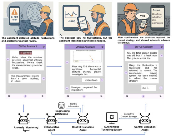 As shown in Figure 10, the intelligent assistant detects abnormal posture fluctuations through the Anomaly monitoring agent and immediately provides feedback to the user. It then invokes the collaborative agent to classify the task based on the anomaly alert, categorizing it under “System Alert” in the “Posture Anomaly” subcategory, and confirms that the task type is a monitoring task. Next, the control evaluation agent is called, and the posture jump graph is displayed to the user with the explanation: “After reaching ring 138, a significant change in horizontal posture occurred in this segment, which needs to be inspected first.” Once the verification is completed, the control execution agent is invoked to notify the autonomous driving system to adjust the control strategy. After resuming automatic propulsion, posture monitoring is repeated, and the system reports that posture is now normal, allowing continuous automatic propulsion. Through proactive communication and real-time feedback, the intelligent assistant effectively reduces the information gap between the driver and the system, enhancing the driver’s trust in the system and improving its safety and reliability.