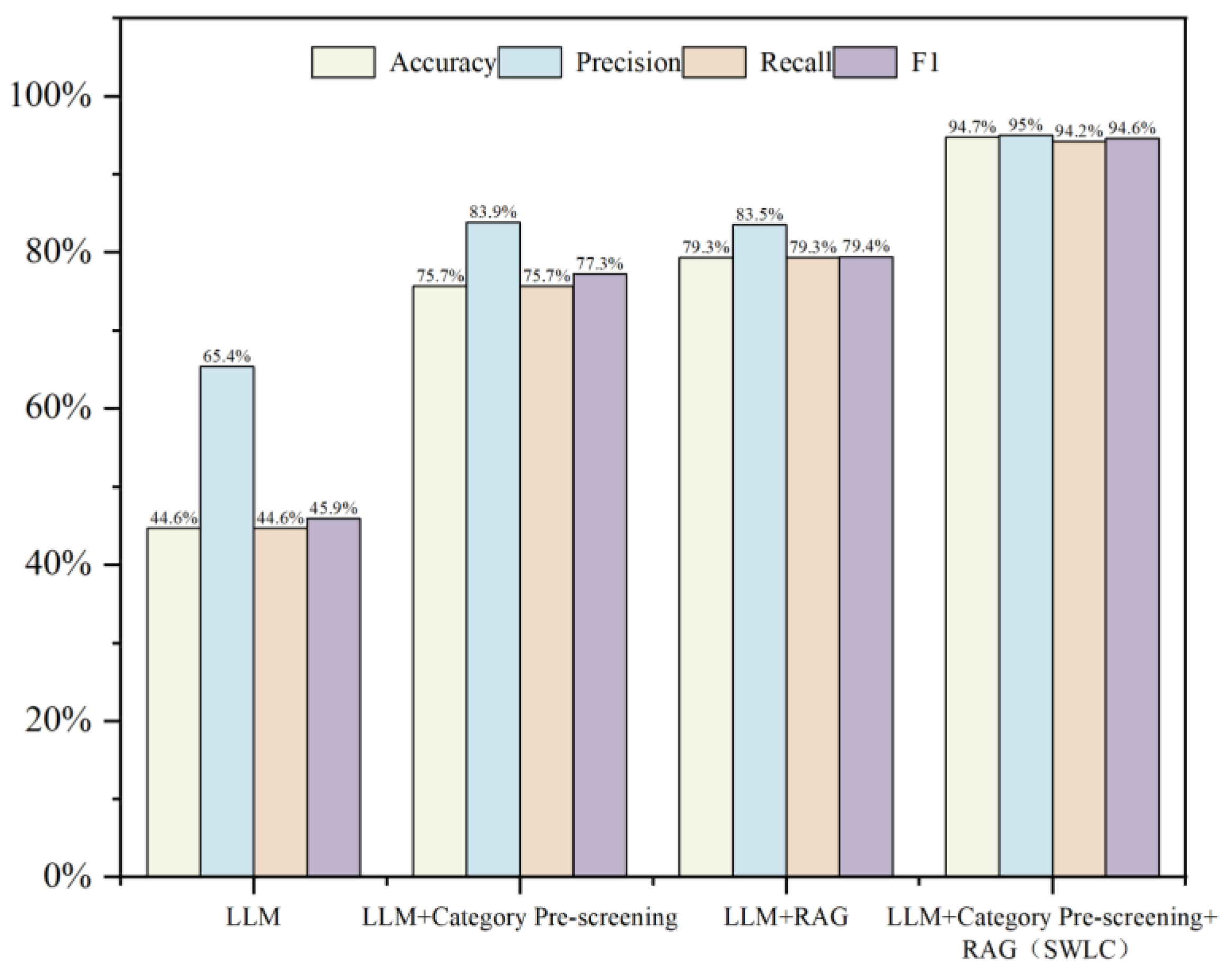 - Experimental Arrangement: To comprehensively verify the effectiveness of the SWLC method, multiple experiments were conducted. The first set of experiments compares the performance of different base LLMs, while the second set evaluates the impact of the category pre-screening and RAG methods on classification accuracy.