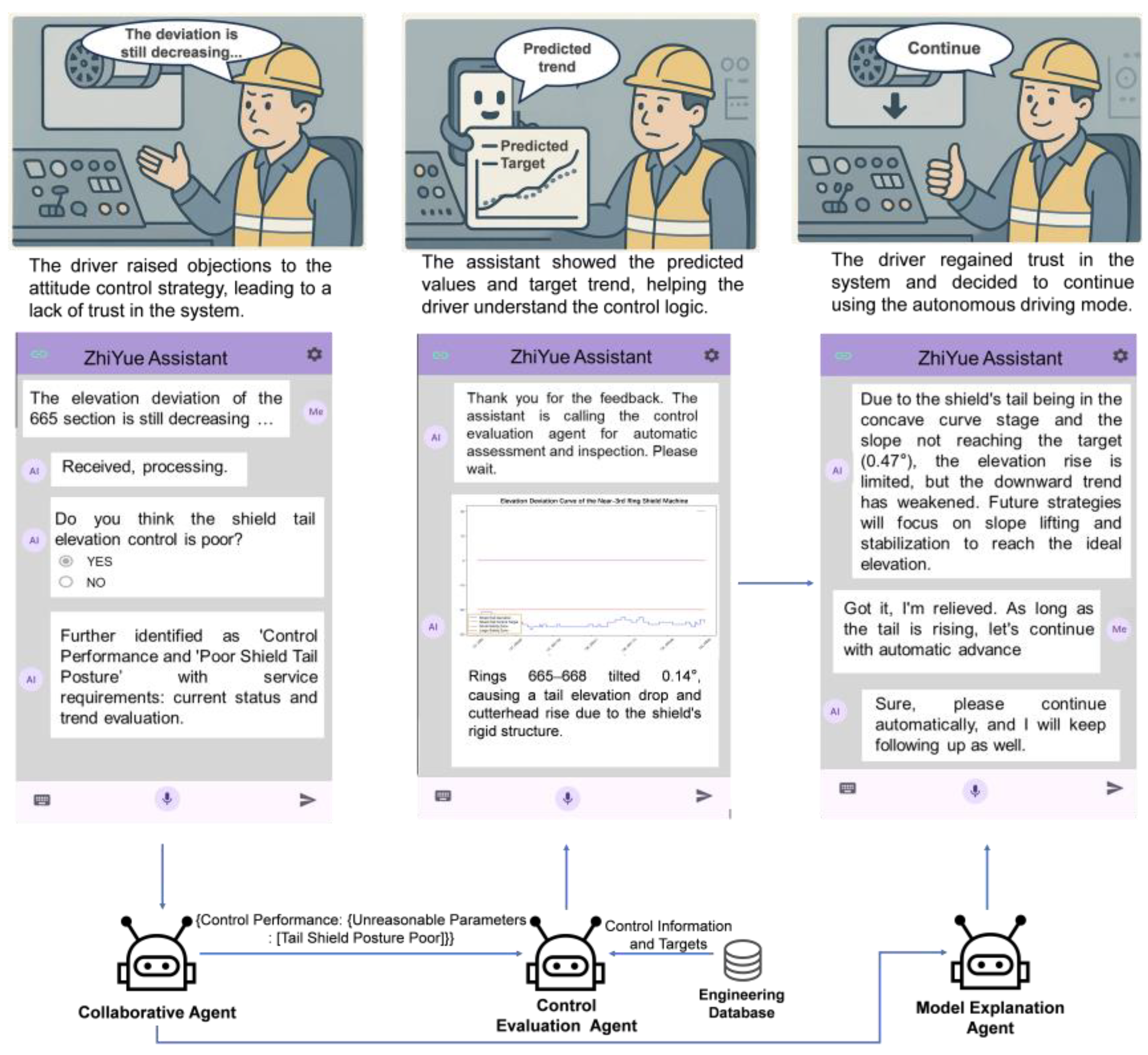 | Insufficient trust | On-site personnel show limited confidence in the autonomous tunneling system. When encountering difficult geological sections or short-term performance fluctuations, they tend to switch to manual operation. | Status and trend assessment | Quantitative and objective evaluation; Visualized charts and curves; Clarification of short-term and long-term trends |