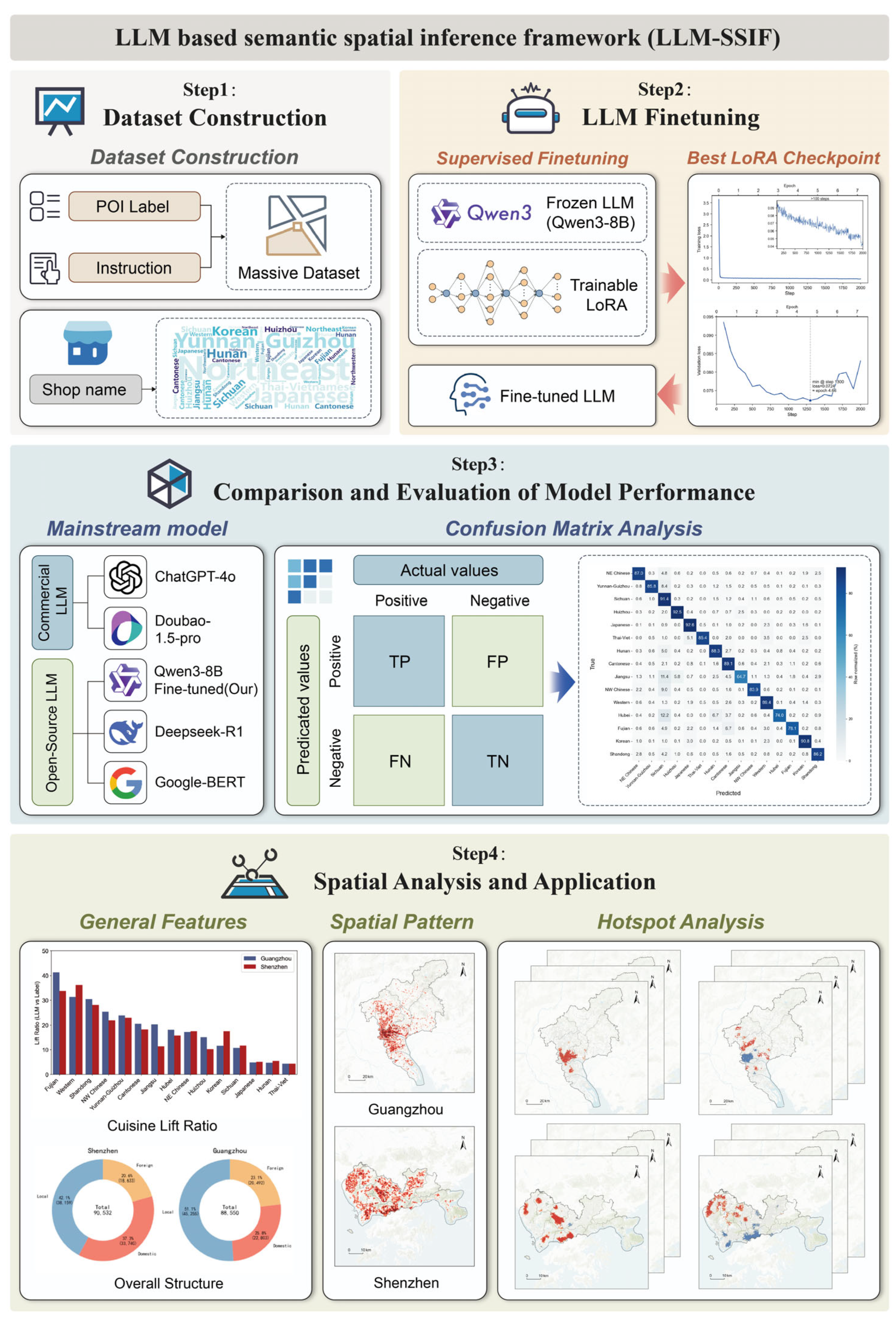- A fine-tuned open large language model (Qwen3-8B + LoRA) achieves superior fine-grained classification of unstructured POI texts (macro-F1 = 0.843), outperforming BERT and commercial LLM baselines while running on consumer-grade hardware.