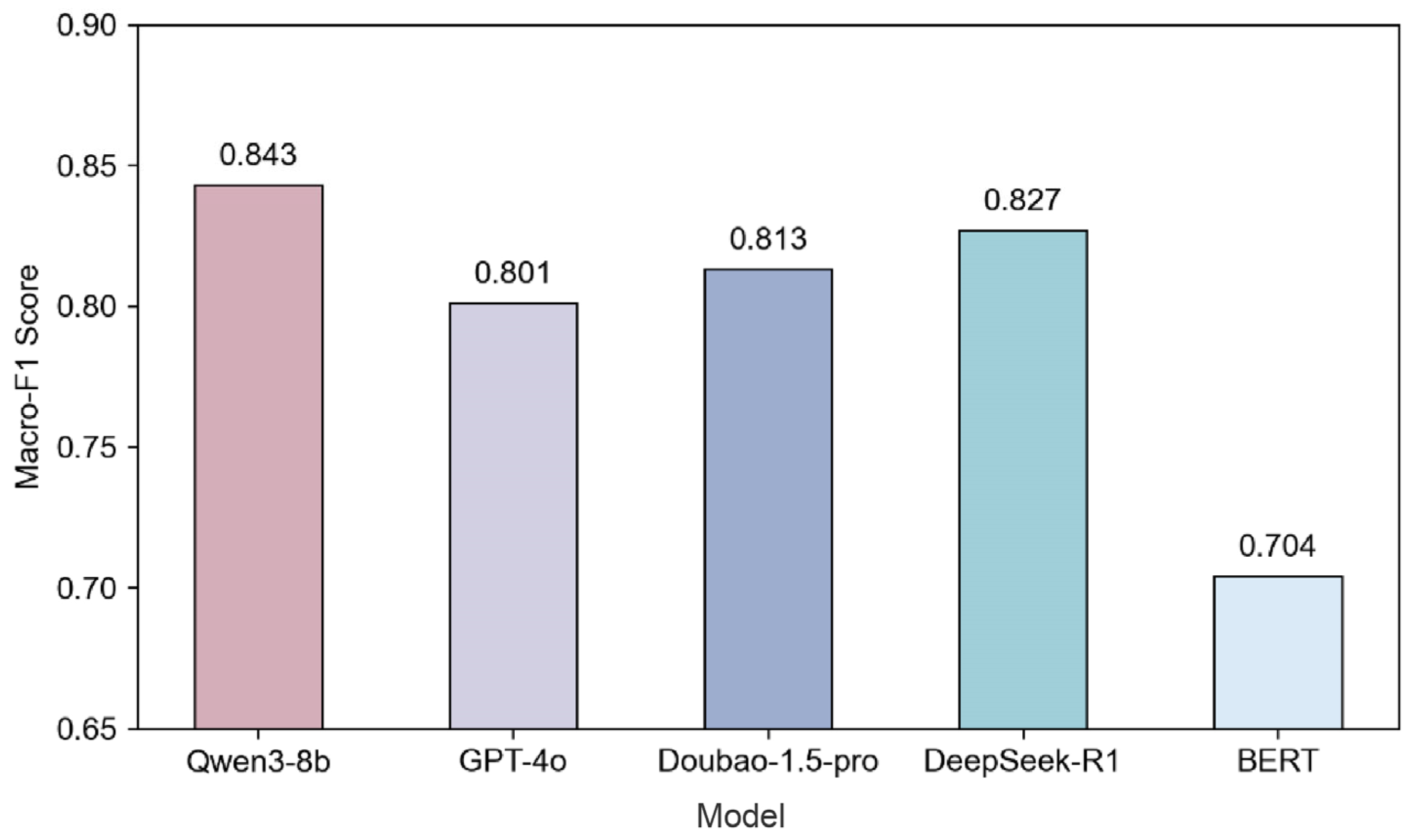 | Model | Qwen3-8B PEFT (LoRA) | GPT-4o | Doubao-1.5-Pro | DeepSeek-R1 | BERT |