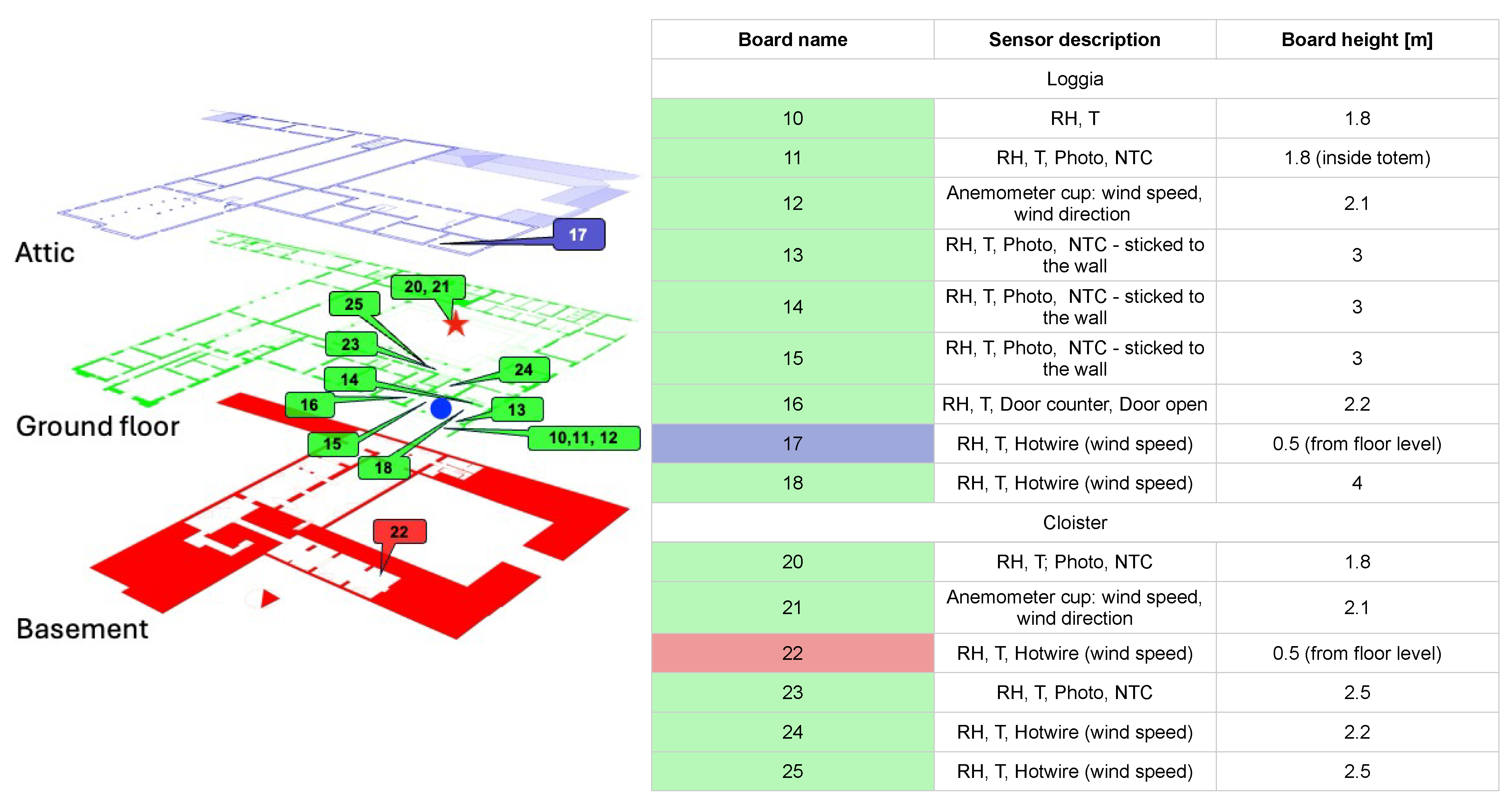 - Height (distance from ground level) as close as possible to human level (to measure the parameters at the point perceived by the user) but still high enough that museum visitors could not interfere with data collection by touching or moving the equipment;
