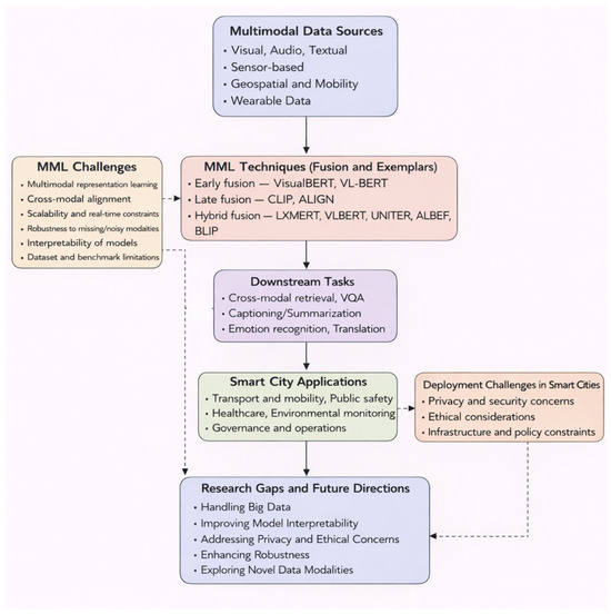 Our study is organized into seven interrelated sections, each of which contributes to a detailed analysis of MML motivated by the challenges of smart cities. In Section 2, we introduce the key concepts of smart cities and review traditional machine learning approaches for urban data analytics and technological timeline while underlining the necessity of MML because of the complexity and diversity of urban data sources. Section 3 explores key MML techniques, including advanced multimodal data fusion strategies based on deep learning architectures, and addresses technical challenges such as data alignment, representation learning, and handling missing or noisy data. Section 4 is dedicated to major domains of a smart city exploring practical applications of MML such as transportation, environmental monitoring, public safety, healthcare, and citizen engagement. Section 5 identifies key challenges and limitations of MML deployment in smart city applications focusing on data privacy, algorithmic bias, scalability, interoperability, and explainability. Section 6 discusses research gaps and future directions revolving around privacy-preserving learning frameworks, context-aware intelligent systems, explainable AI, and the development of standard multimodal datasets and benchmarks.