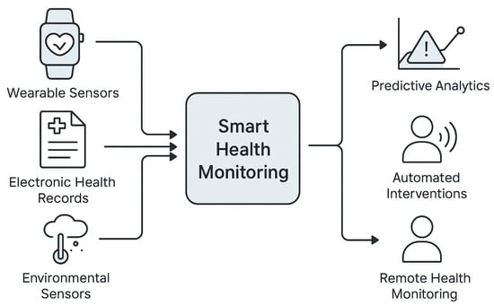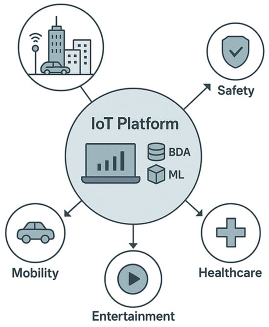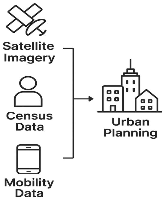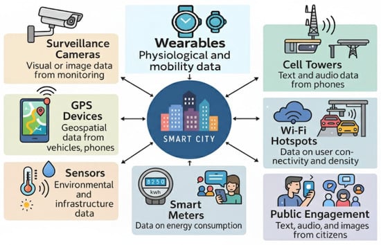 As shown in Figure 2, smart city sensing relies on diverse modalities, including visual data from surveillance cameras and satellite imagery, environmental and infrastructure readings from IoT sensors, geospatial information from GPS-enabled devices, physiological and behavioral signals from wearables, connectivity data from Wi-Fi hotspots and cell towers, energy usage from smart meters, and multimodal citizen-contributed content via public engagement platforms. Each of these data types contributes to specific urban applications: visual streams support traffic monitoring, public safety, and event management [18,29]; sensor-based readings enable pollution monitoring and climate modeling [23,30]; textual sources such as tweets and reports drive sentiment analysis and social media monitoring [20,31]; geospatial data improves mobility optimization and traffic management [21,22]; and behavioral or physiological data inform urban mobility and public health monitoring [13,32].