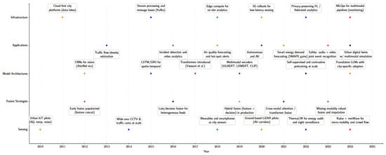The timeline of key advances in multimodal machine learning for smart cities. This timeline shows the evolution from early IoT-based sensing and deep learning to modern cross-modal architectures, foundation models, and vision–language–action systems, highlighting how technical progress has enabled increasingly intelligent and autonomous urban services [25].