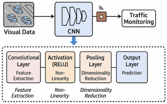 CNNs are powerful models traditionally used for image and video processing tasks. In smart city contexts, CNNs can extract spatial hierarchies from traffic camera feeds, which can then be combined with IoT sensor data (e.g., air quality, noise levels) to inform mobility planning and environmental policy. This is crucial for applications in smart cities, where large-scale data from diverse sources such as traffic cameras, environmental sensors, and satellite imagery must be processed in real-time to provide actionable insights. Figure 7 depicts how CNNs integrate visual data (e.g., traffic camera footage) for traffic monitoring in smart cities.