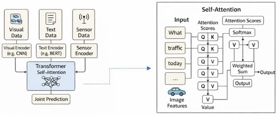 A diagram illustrating the self-attention mechanism in a transformer model for multimodal fusion. The diagram shows how visual data, text data, and sensor data are processed by separate encoders before being integrated into the self-attention layer of the transformer for joint prediction.