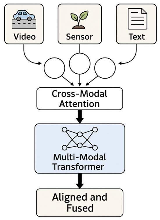 Architecturally, hybrid fusion is often implemented using modality-specific encoders followed by cross-modal transformers or co-attentional layers, as discussed in recent surveys and foundational model analyses [1,11,43,44,45,46]. These approaches preserve the advantages of independent representation learning while introducing mechanisms for joint reasoning across modalities, offering a strong balance between expressiveness, modularity, and scalability for heterogeneous urban data streams.