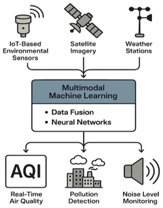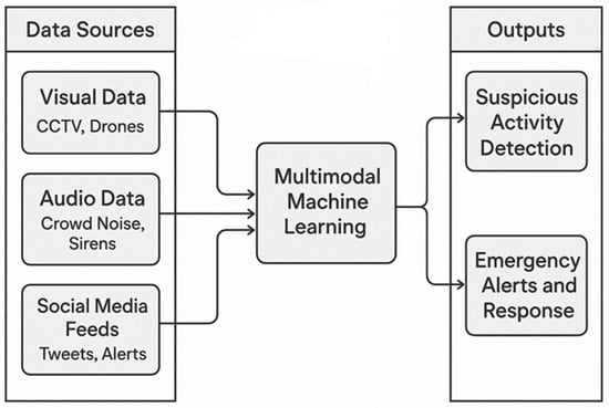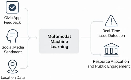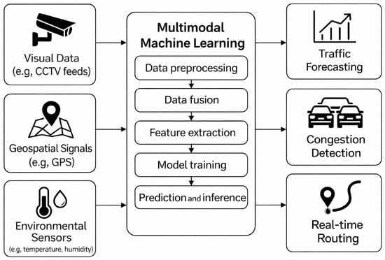 Within the domain of artificial intelligence, MML represents a significant shift in how computational models handle complex environments. Comprehensive surveys highlight the increasing role of machine learning in analyzing temporal data and enhancing decision-making processes in smart city applications [5,6,7,8]. Unlike traditional methods that process only unimodal data such as text, audio, or visual, MML integrates multiple data modalities simultaneously [9]. This approach includes structured and unstructured data sources like documents, images, audio, video, geographical information, biometrics, and IoT sensor data.