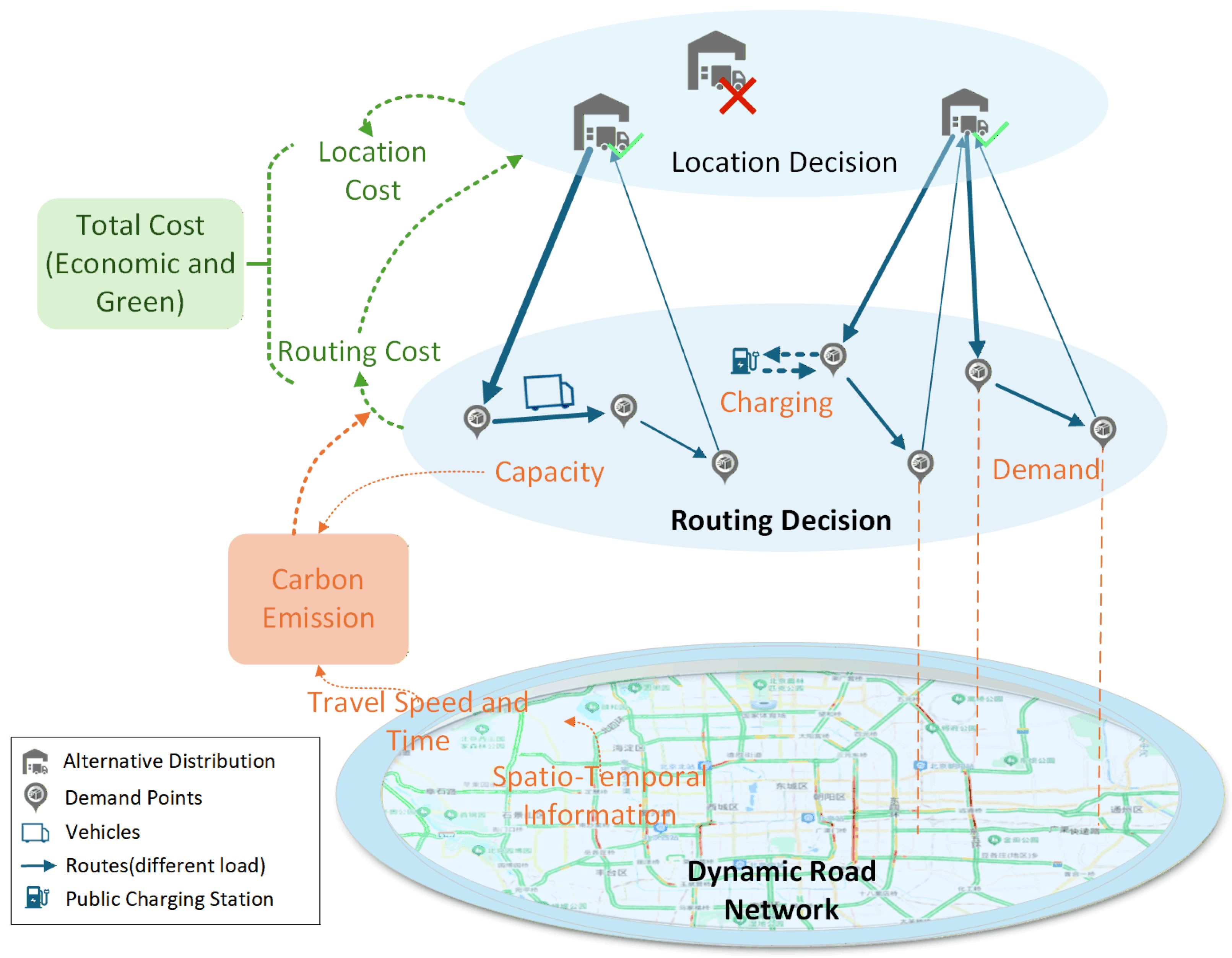 - Proposes a spatio-temporal dynamic carbon emission calculation method integrating real-time traffic dynamics and electric logistics vehicle energy consumption, enabling precise emission quantification for urban logistics.