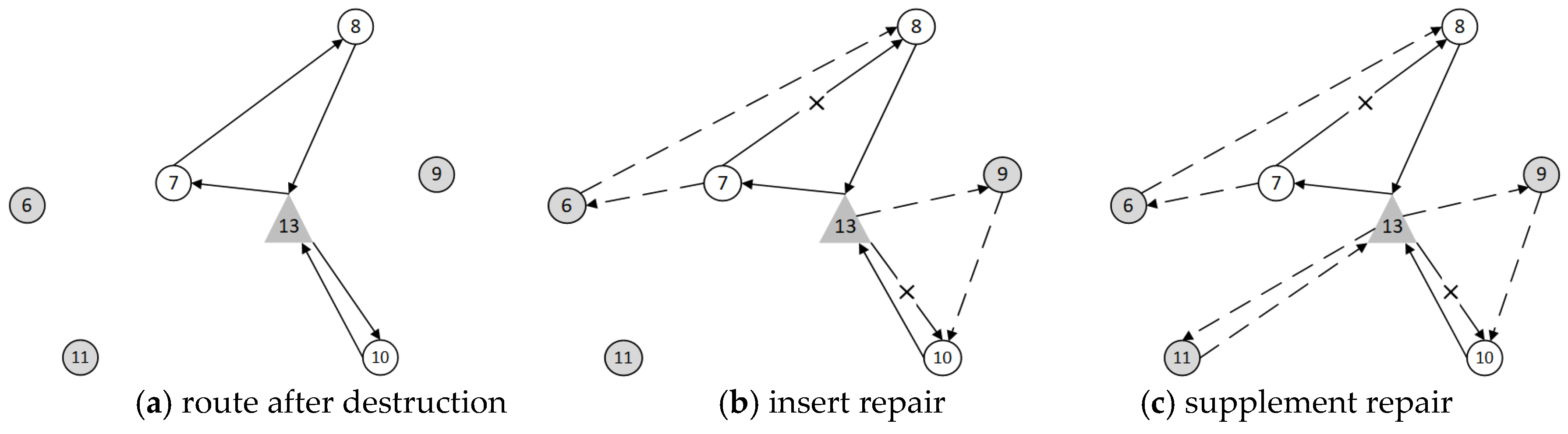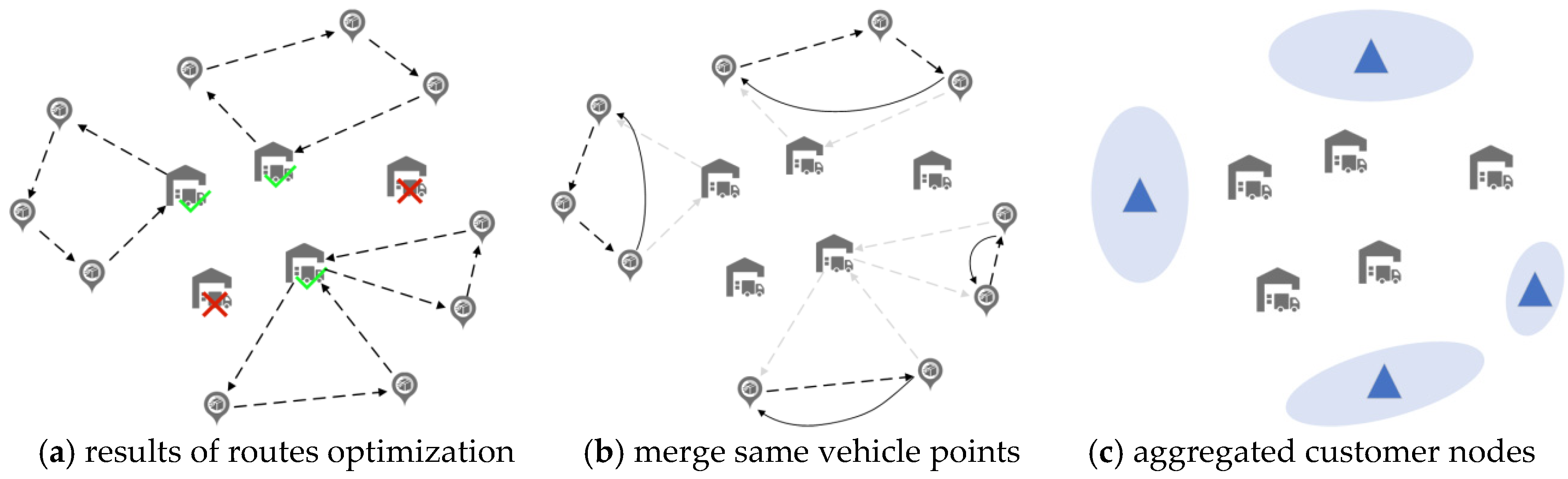 - Multiple-center allocation, which violates the original assignment constraints, assigning the point to the selected distribution center with the smallest assignment cost; if no such center exists, selecting the distribution center serving the most aggregated customer nodes.