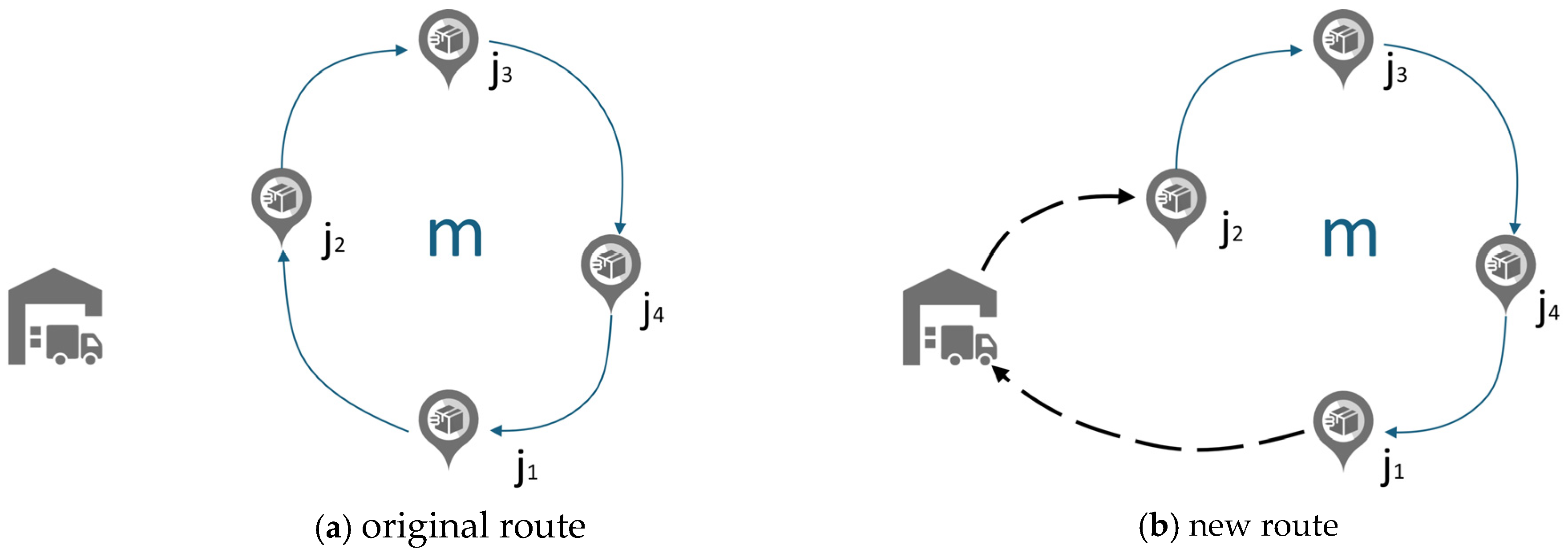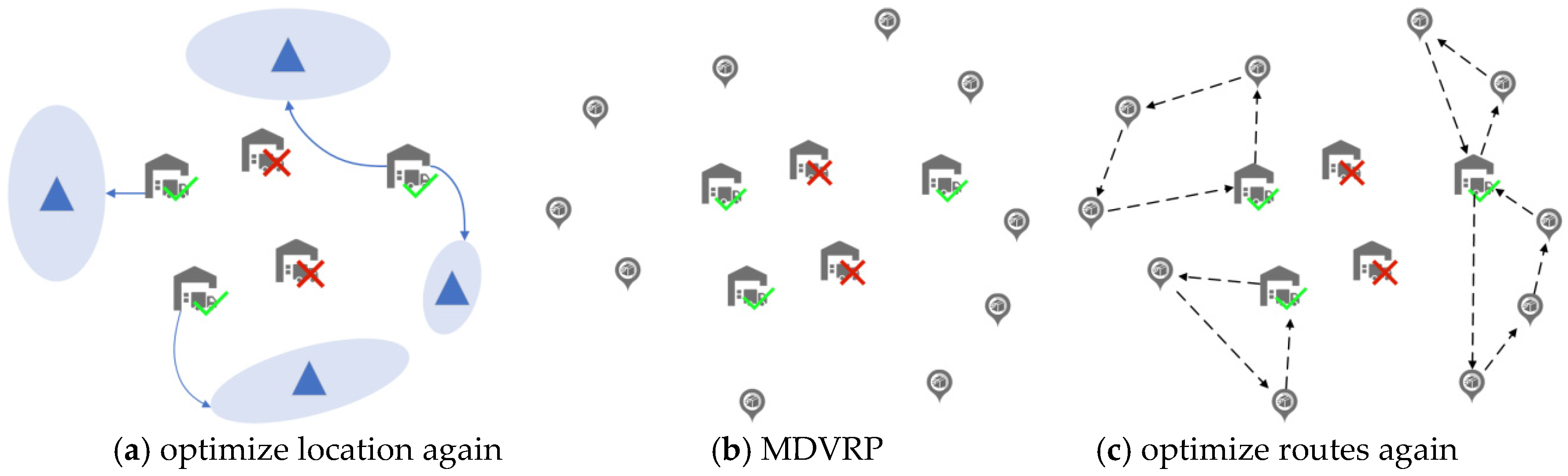 - Unallocated scenario, which violates the original assignment constraints, assigning unallocated aggregated customer nodes to selected distribution centers by minimizing assignment costs, ensuring capacity constraints are not exceeded; if selected centers cannot satisfy all demands, opening the not yet selected distribution center with the smallest assignment cost to meet remaining demands.