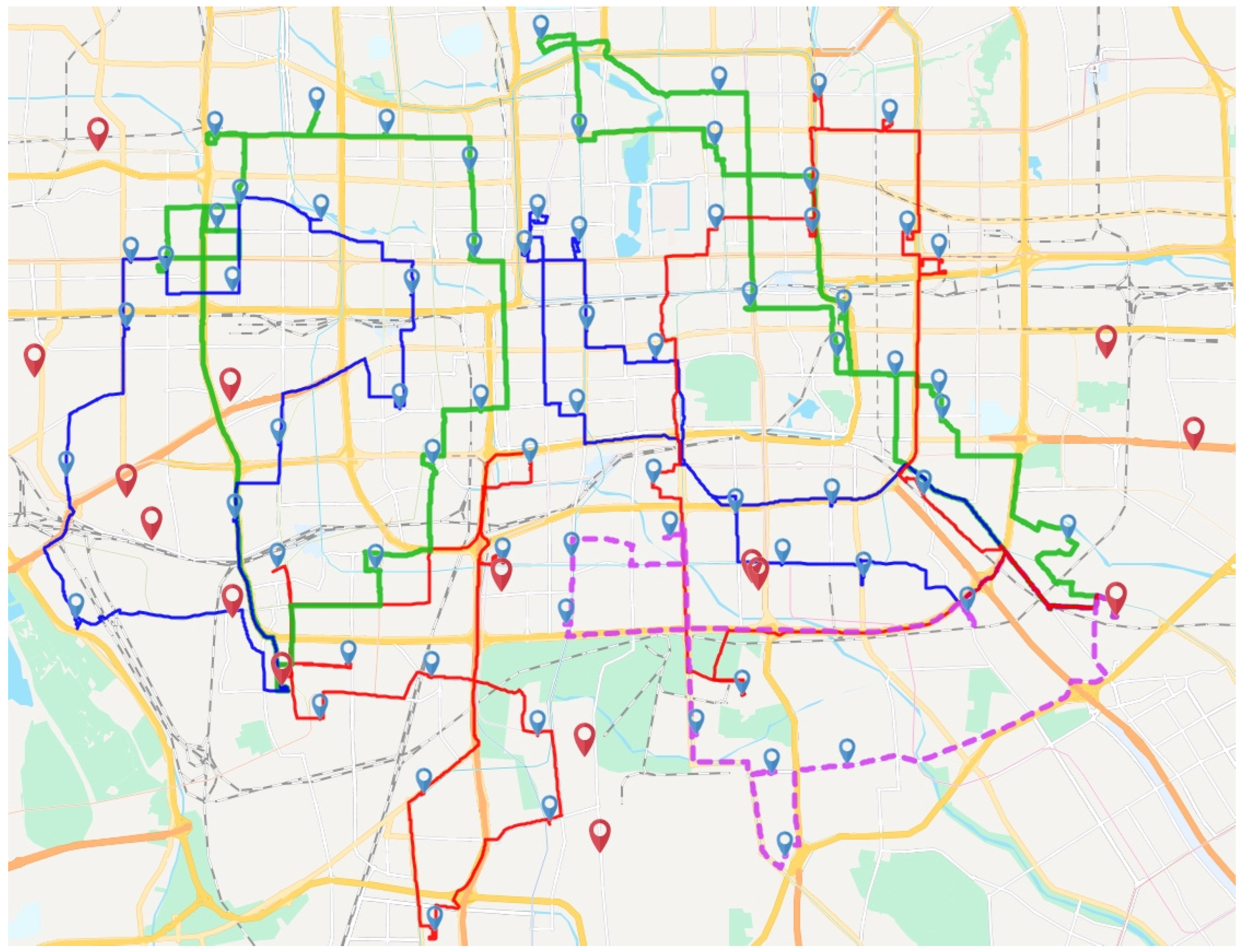 4.4. Stage 2: Route Optimization Algorithm Based on Improved Ant Colony Optimization