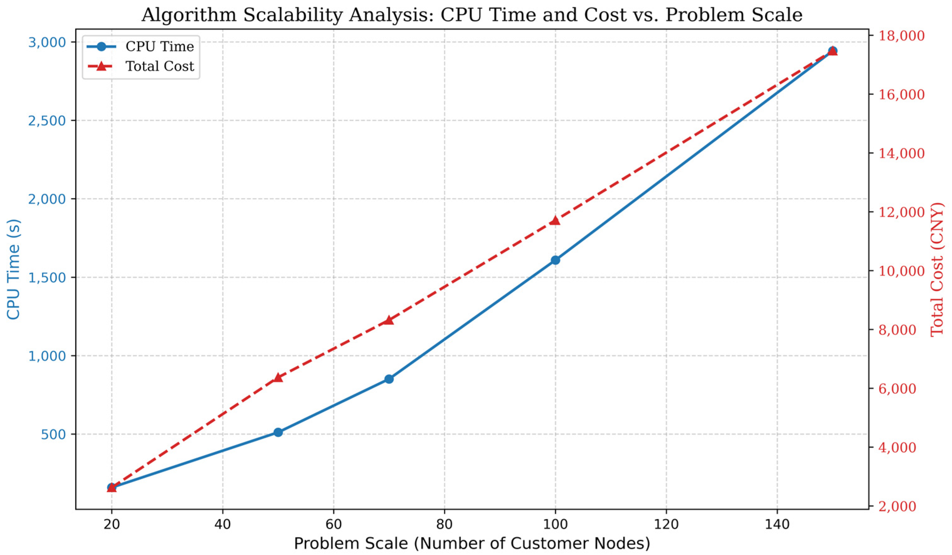 | Problem Scale (Nodes) | Average CPU Time (s) | Best Total Cost (CNY) |