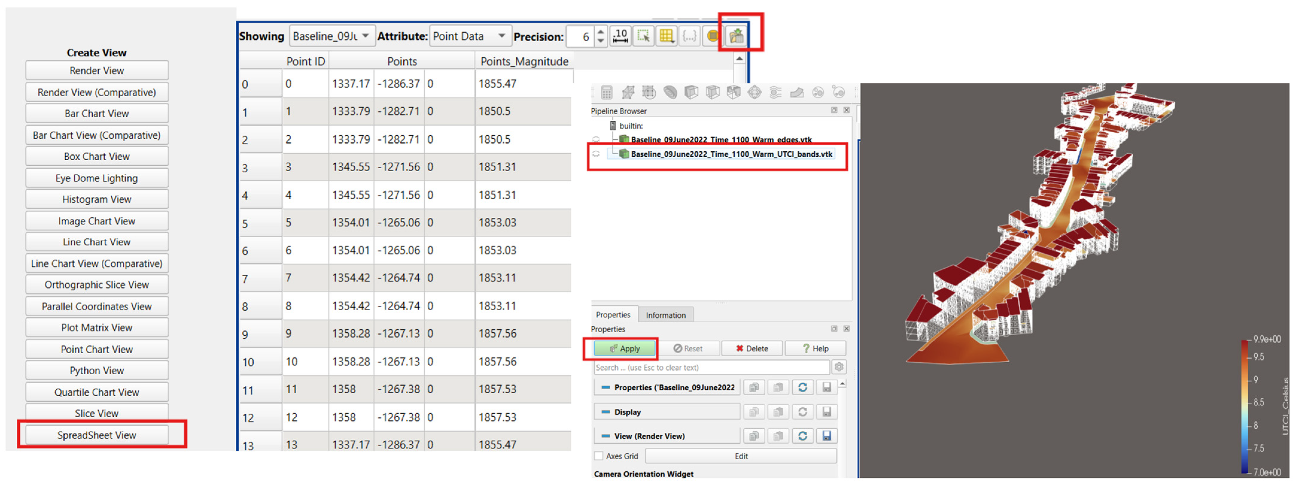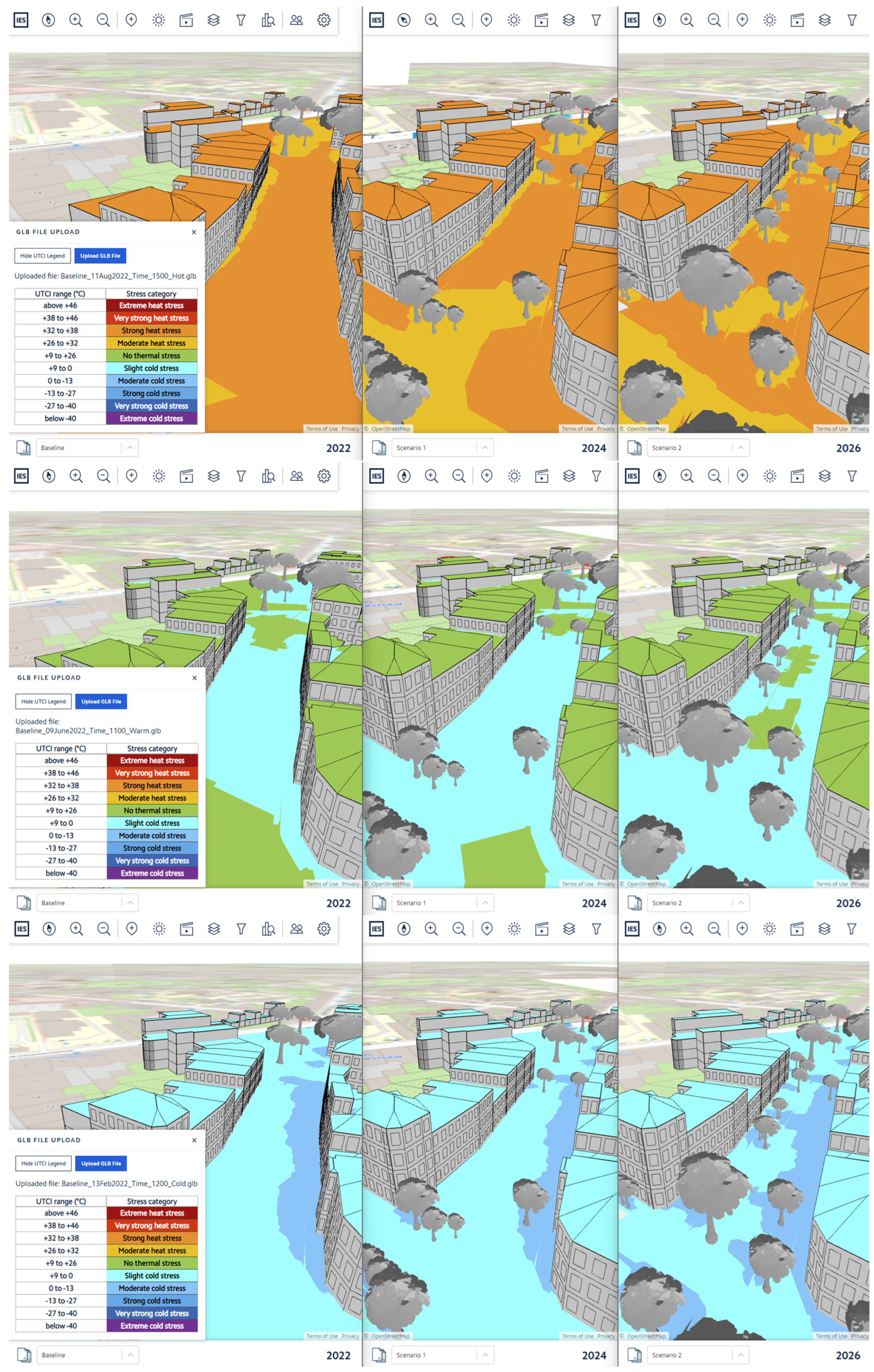 - Results visualization: The tool supports exporting results for advanced visualization and online access. For instance, simulation outputs can be saved as a .glb file and imported into the iCIM platform (via Analysis > UTCI Visualization) to enable comparative analysis across scenarios in a web-based 3D viewer. For detailed quantitative evaluation, the retained simulation data can be opened in external software like ParaView [22] (version 6.0.1, see Figure 1), which allows inspection of spatial variations and side-by-side comparison of planning alternatives (i.e., winter vs. summer conditions).