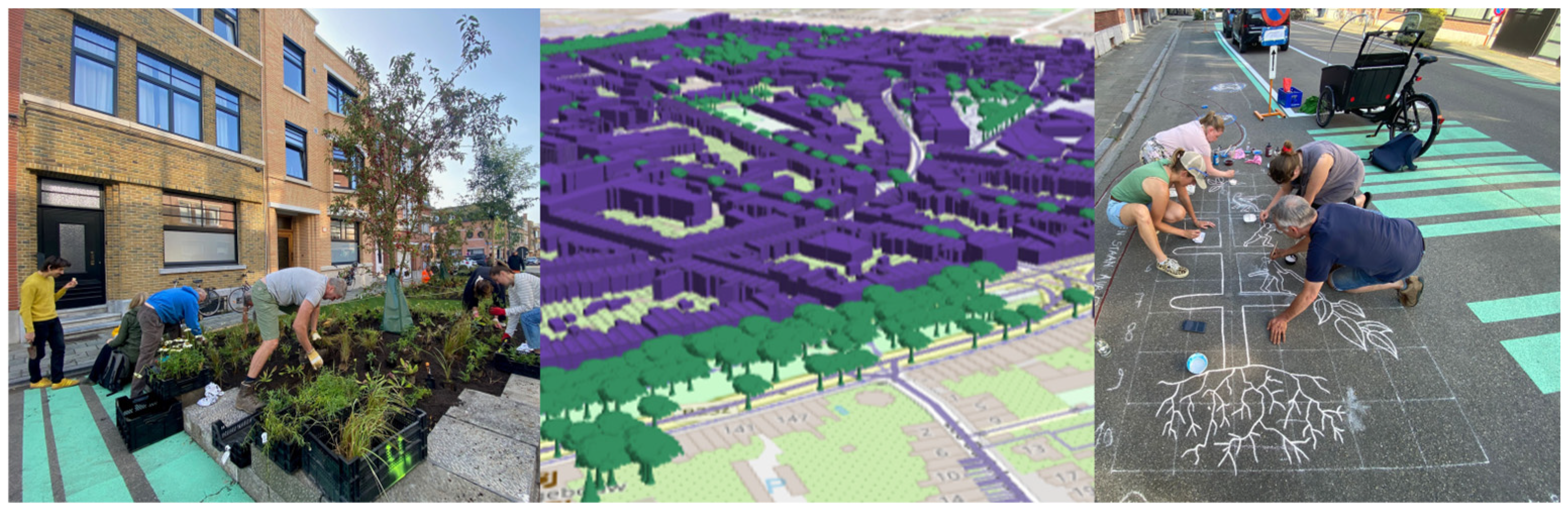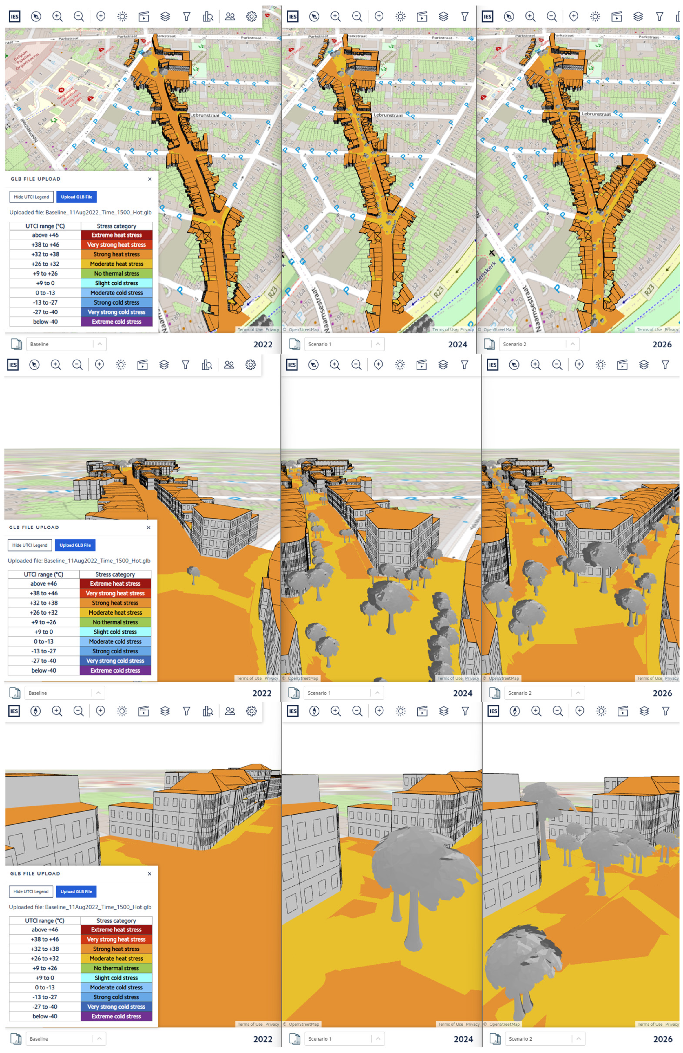 - Modeling in iCD (version 2025.2): The model is developed by combining the automatic urban geometry import from OpenStreetMap with NBS and public-space planning details obtained from Leuven municipality.