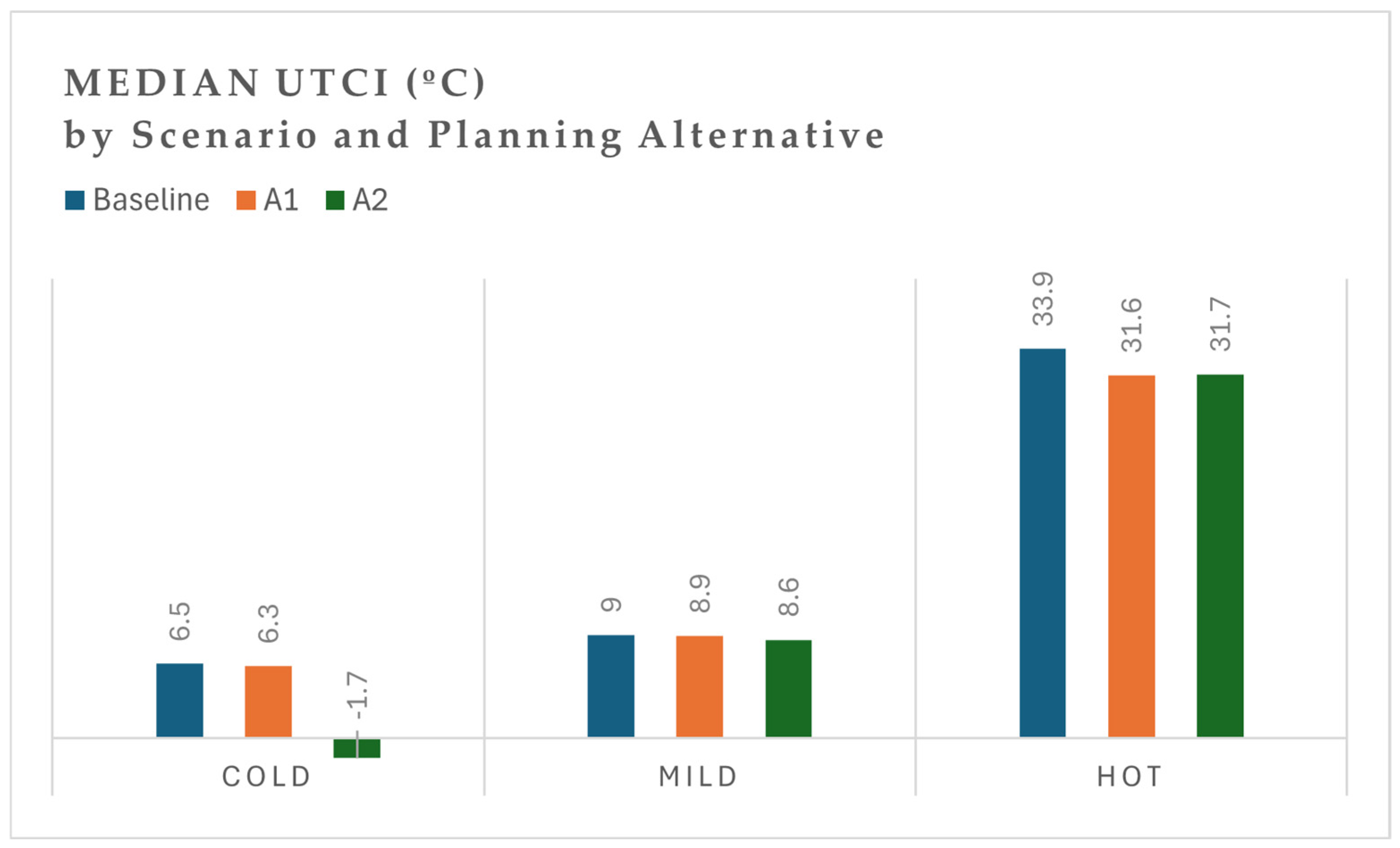 3.1. UTCI Values Under Different Scenarios