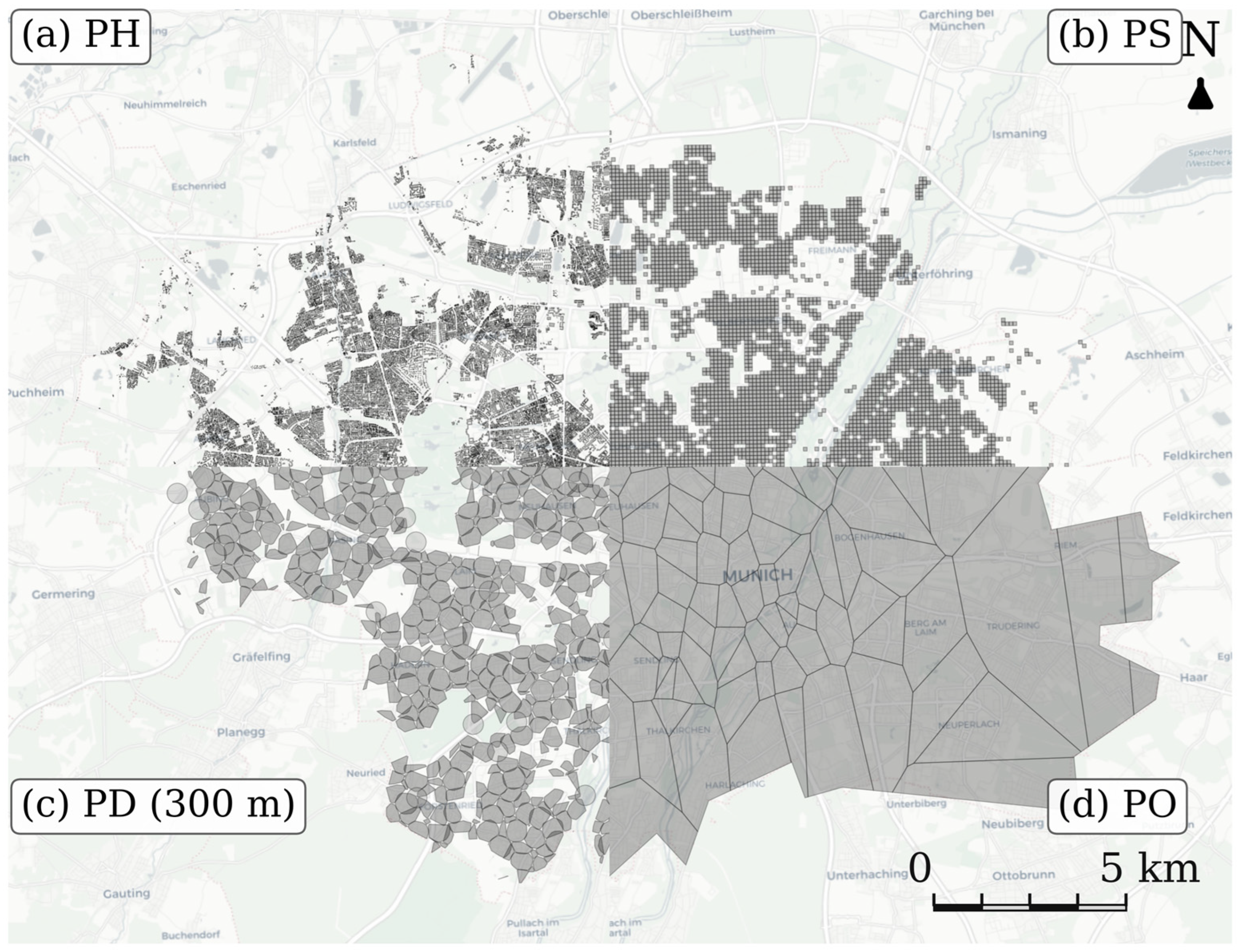 - Square-based (PS): Symmetrical placement of the stations in the center of each census square with an edge length of 100 m.