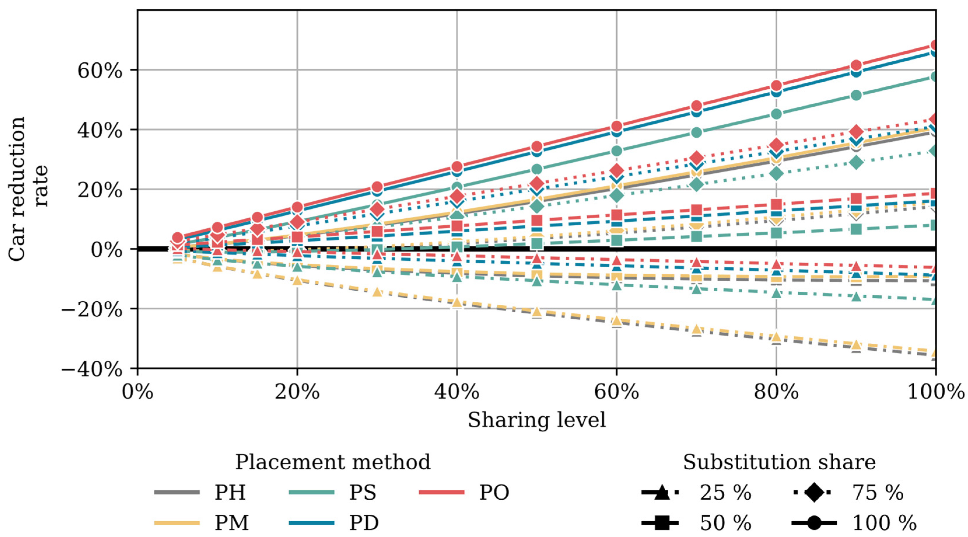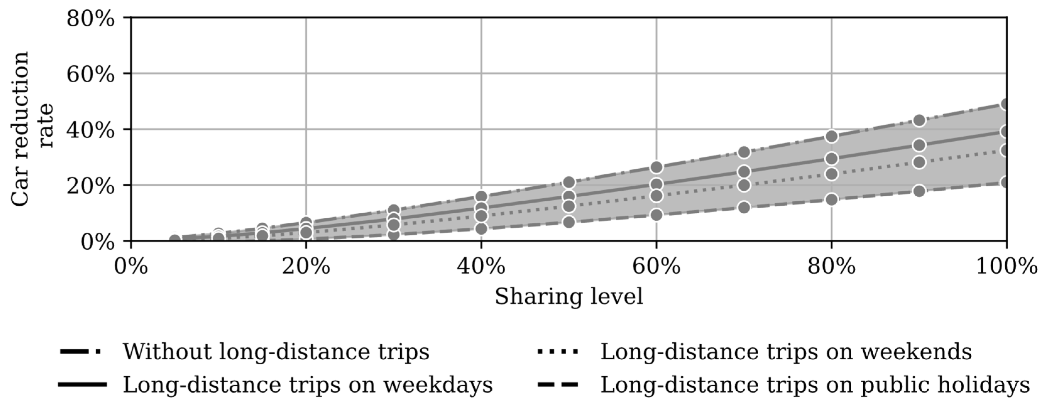 - The number of car-sharing cars needed is influenced the most by long-distance trips.