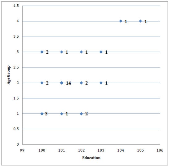 In Figure 1, the y axis denotes age group and values from 1 to 4 which signify different age groups such as 1 for 18 to 24, 2 for 25 to 44, 3 for 45 to 64, 4 for 65 plus. x axis denotes the Education level and values 100 to 105 which stand for 100 for Third level non degree, 101 for Third level degree, 102 for Post graduate, 103 for Upper Secondary, 104 for Lower Secondary, 105 for Primary. Interestingly, most of the young people who participated were Third level degree holders and more than 75% of young people in the survey who adopted Information Technology were highly educated.