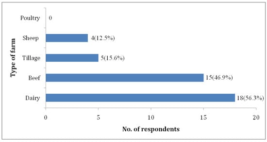 From total subjects, more than 60% of the respondents were completely dependent on farming while others (37.5%) are doing farming part-time. Moreover, 28.1% of the respondents followed mixed farming (Type of farming which involves both the growing of crops and the raising of livestock) while 71.9% were not. 56.3% of the participants in the survey were dairy farmer while the least (12.5%) were sheep farmers as shown in the Figure 2.
