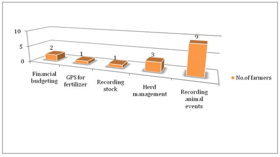 Most of the farmers used CC technology for recording the animal data and stock. Other farmers used it in applications like GPS for fertilizer, grass management, financial budgeting etc. as shown in Figure 8.