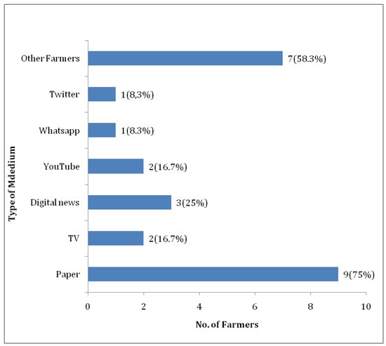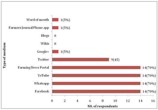 The farmers who embraced information technology were asked about which medium they used to access information through any digital platform. Fourteen out of 20 respondents selected YouTube, Whatsapp, Facebook and Farming news portal as the main intermediate to get information about new technology as shown in Figure 11. However, 45% of respondents found Twitter as another source of information. While a small percentage (1%) of people found information through Farmers Journal App, Google Plus and word of mouth. Interestingly, none of them seek the help of wikis or blogs to find information, as shown in Figure 11.