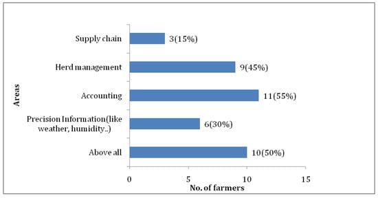 The adopter farmers were asked to pick the area of preference where more applications based on farming need to be developed and the result showed that 55% of farmers need applications for Accounting on farm, 45% need in herd management while another major portion (50%) claims that there is a need for applications in all the areas such as supply chain, herd management, accounting and precision information (like weather, humidity etc.) as shown in Figure 13.