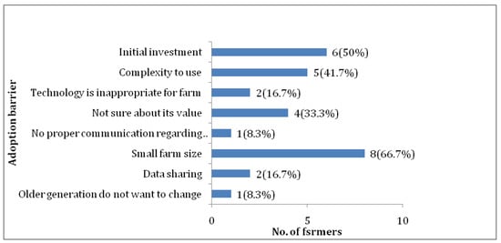 There were difficulties in adopting any information technology among the non-adapter farmers that could also be relatable to the already existent users that could help in enhancing the user experience, as shown in Figure 14. However, more than 65% of farmers felt that small farm size was the primary reason while another major portion found difficulty in the initial investment (50%) and Complexity to use (41.7%). Other issues like uncertainty about the value of the technology used (33.3%), inappropriate technology on farm (16.7%), data sharing (16.7%), lack of knowledge about the technology (8.3%) and the difficulty of using technology among older farmers (8.3%) make the use of technology challenging.