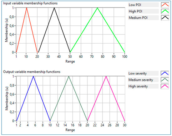 Input membership functions for POI and output membership functions for the disease severity grades.