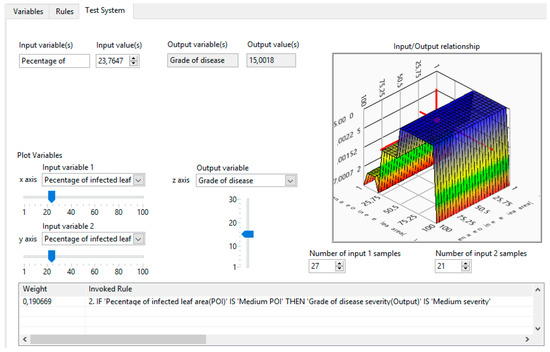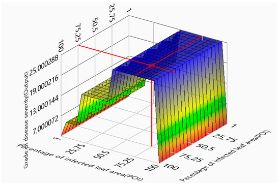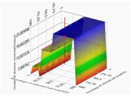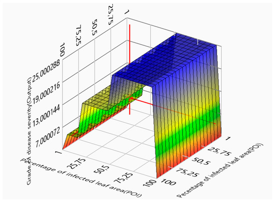 - Rule 2: If ‘Percentage of infected leaf area (POI)′ IS ‘Medium POI’ THEN ‘Grade of disease severity (OUTPUT)’ IS ‘Medium severity’.