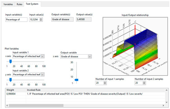 - Rule 3: If ‘Percentage of infected leaf area (POI)′ IS ‘High POI’ THEN ‘Grade of disease severity (OUTPUT)’ IS ‘High severity’.